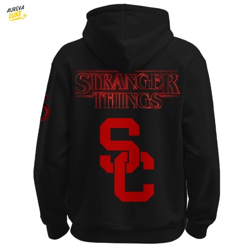 USC x Stranger Things hoodie with a bold red–black design